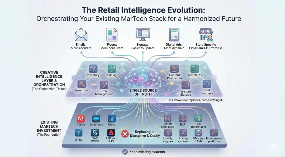 Retailers have already invested heavily in their marketing technologies such as Adobe, Salesforce, Unica, SAS CI360, AEP and AJO, Custom data lakes, POS integrations, Loyalty engines, Pricing systems, PIMs and DAMs, and E commerce platforms. Replacing these would be disruptive, costly, and unnecessary.