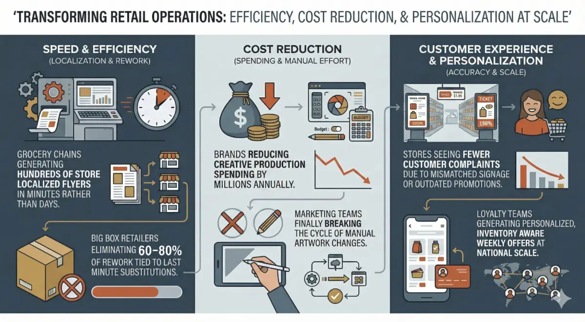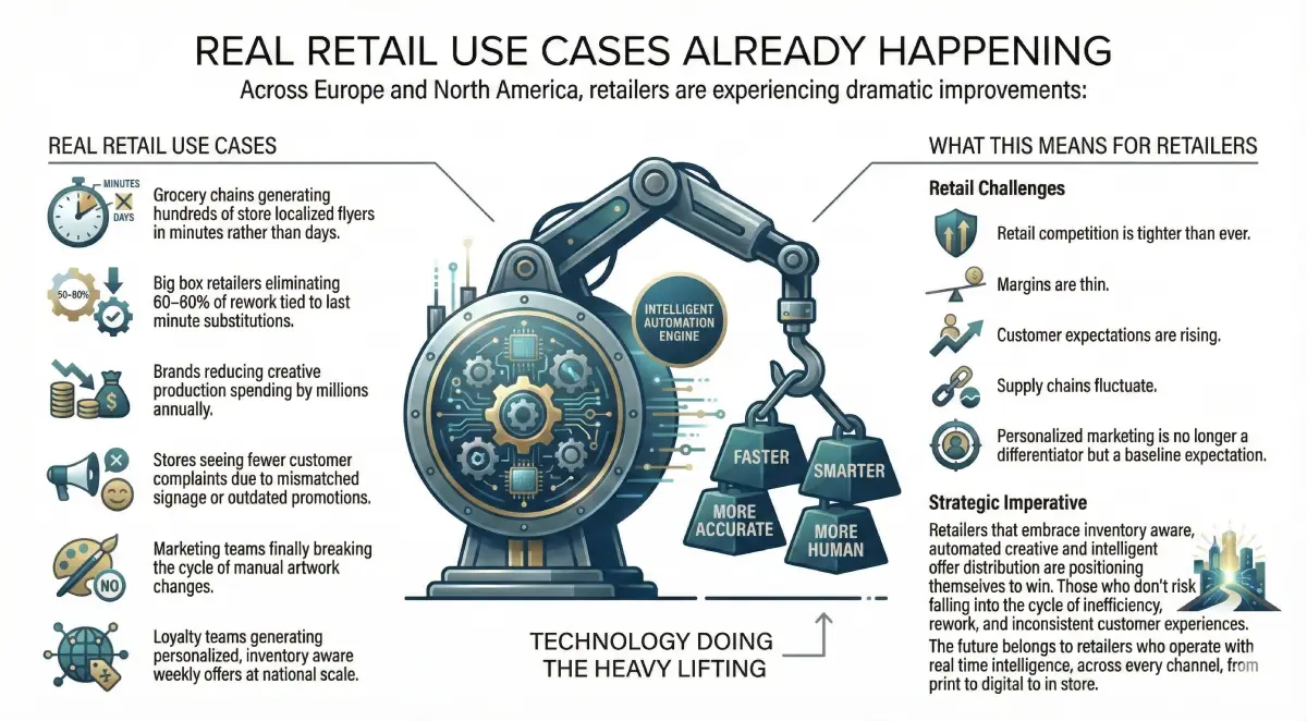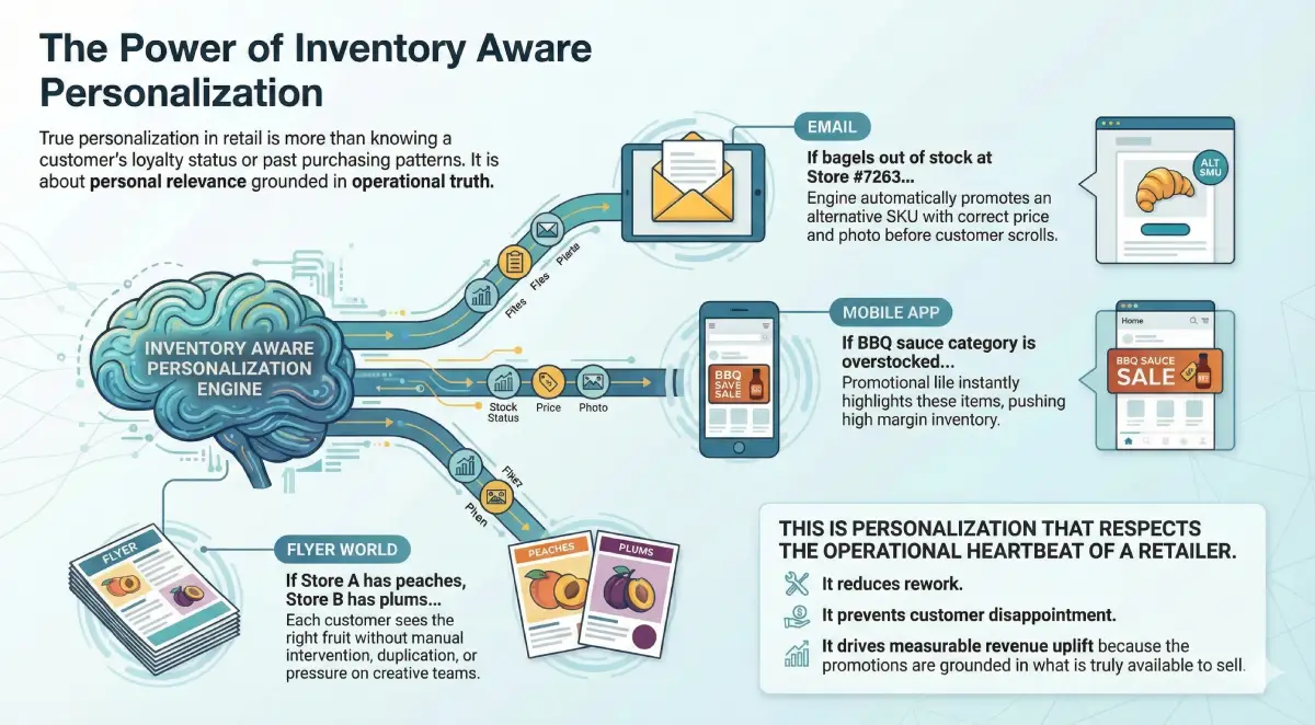 These solutions automate creative updates, personalize offers based on actual product availability, and ensure every channel reflects operational reality without constant rework. Retailers using this approach are dramatically reducing creative rework, accelerating flyer and campaign production, lowering costs, and improving customer satisfaction. The future of retail marketing belongs to organizations that adopt real-time, inventory-aware personalization—delivering accurate, relevant experiences at scale while freeing teams from manual, error-prone processes.